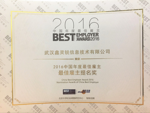 2017年1月,由北京大學社會調(diào)查研究中心和智聯(lián)招聘聯(lián)合發(fā)起的“2016中國年度最佳雇主”活動評選近日揭曉:武漢鑫靈銳從萬余家參評企業(yè)中脫穎而出,榮獲“2016年度中國最佳雇主”提名獎。